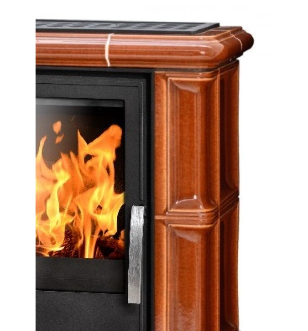 Kachlová dvouplášťová teplovzdušná (konvekční) kamna s kombi topeništěm (plech/litina) a s centrálním přívodem vzduchu. Ocelové topeniště má šamotovou vyzdívkou, litinová dvířka a litinový rošt.