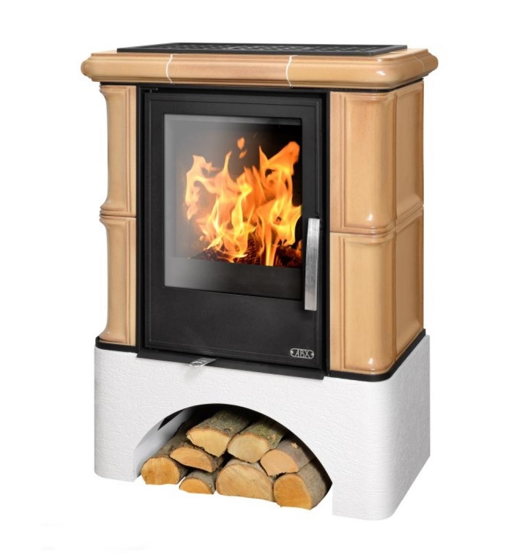 Kachlová dvouplášťová teplovzdušná (konvekční) kamna s kombi topeništěm (plech/litina) a s centrálním přívodem vzduchu. Ocelové topeniště má šamotovou vyzdívkou, litinová dvířka a litinový rošt.