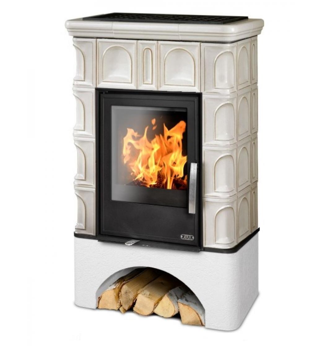 Kachlová dvouplášťová teplovzdušná (konvekční) kamna s kombi topeništěm (plech/litina) a s centrálním přívodem vzduchu. Ocelové topeniště má šamotovou vyzdívkou, litinová dvířka a litinový rošt.