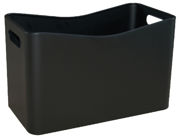 Černý ocelový koš obdélníkového tvaru s plastovými rukojeťmi.