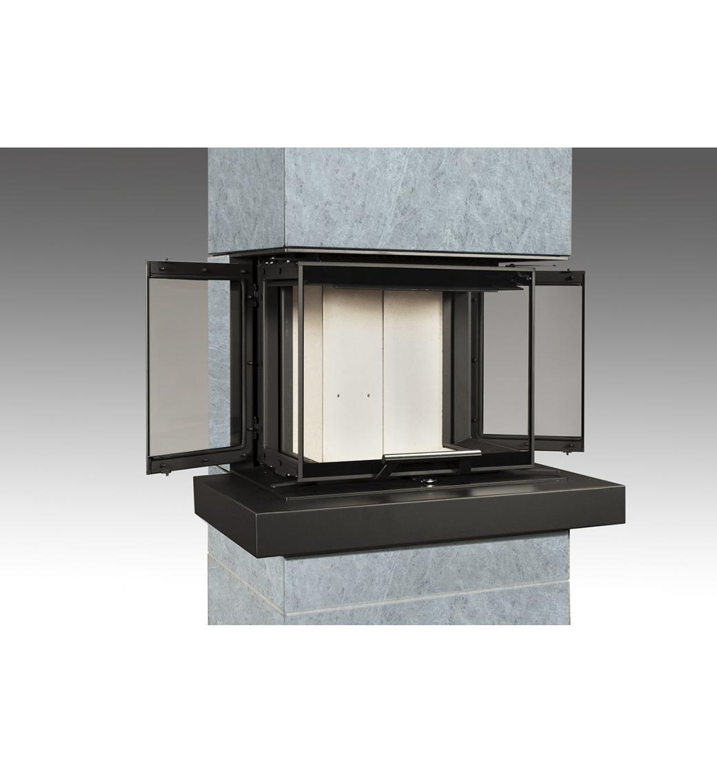 Terciární vzduch přivedený do horní části spalovací komory optimalizuje hoření. Inovativní systém DOUBLE SPIN zajišťuje vyšší účinnost krbu a výstup spalin lze provést buď horním, nebo zadním odvodem. Sekundární přívod vzduchu udržuje sklo dvířek čisté a zajišťuje tak nerušený pohled na plameny. Regulace primárního a sekundárního přívodu vzduchu je snadná díky jedinému ovládacímu prvku.