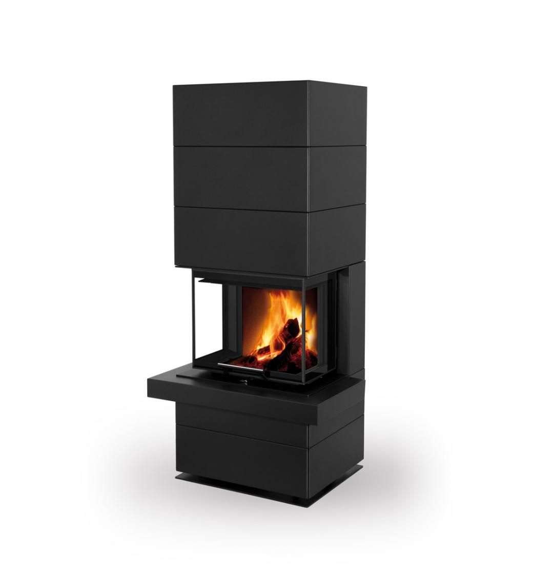 Terciární vzduch přivedený do horní části spalovací komory optimalizuje hoření. Inovativní systém DOUBLE SPIN zajišťuje vyšší účinnost krbu a výstup spalin lze provést buď horním, nebo zadním odvodem. Sekundární přívod vzduchu udržuje sklo dvířek čisté a zajišťuje tak nerušený pohled na plameny. Regulace primárního a sekundárního přívodu vzduchu je snadná díky jedinému ovládacímu prvku.