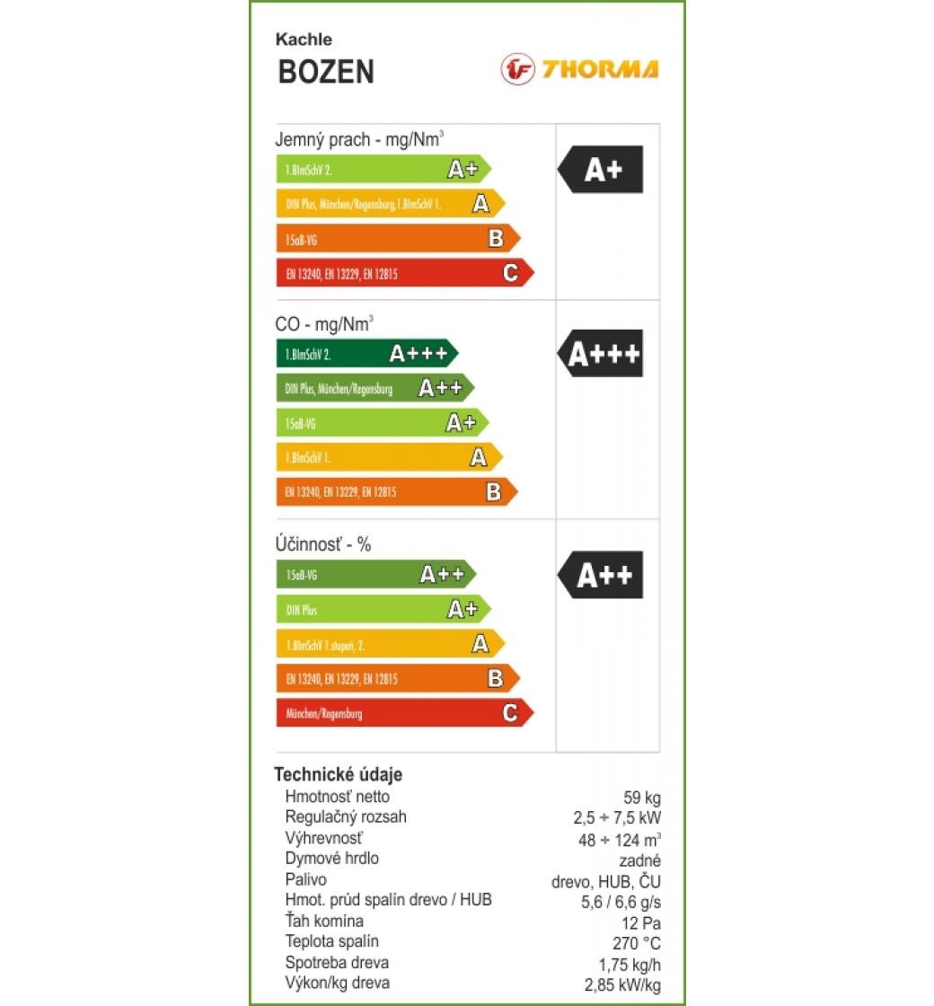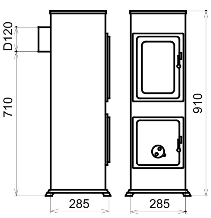 Vývod kouřovodu je zezadu pro kouřovod o průměru D120. Přikládací dvířka a dvířka popelníku jsou těsněná sklotextilní šňůrou. Na obou dvířkách je klapka