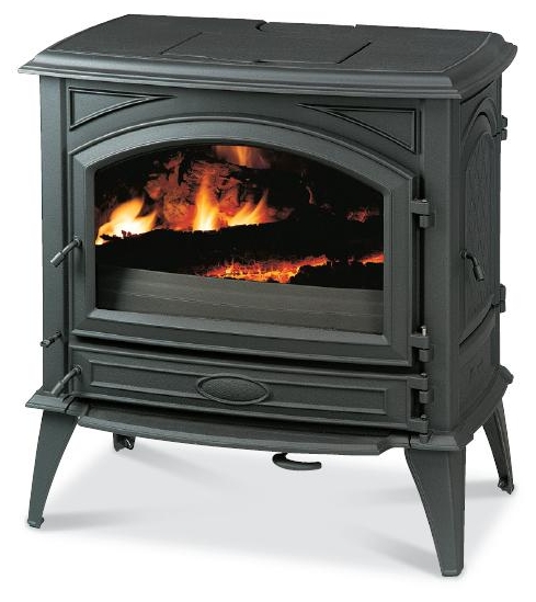 Celolitinová vícepalivová krbová kamna na dřevo, dřevěné brikety, uhlí nebo hnědouhelné brikety s v povrchovém provedení antracit. Velké prosklení předních přikládacích dvířek, boční přikládací dvířka.