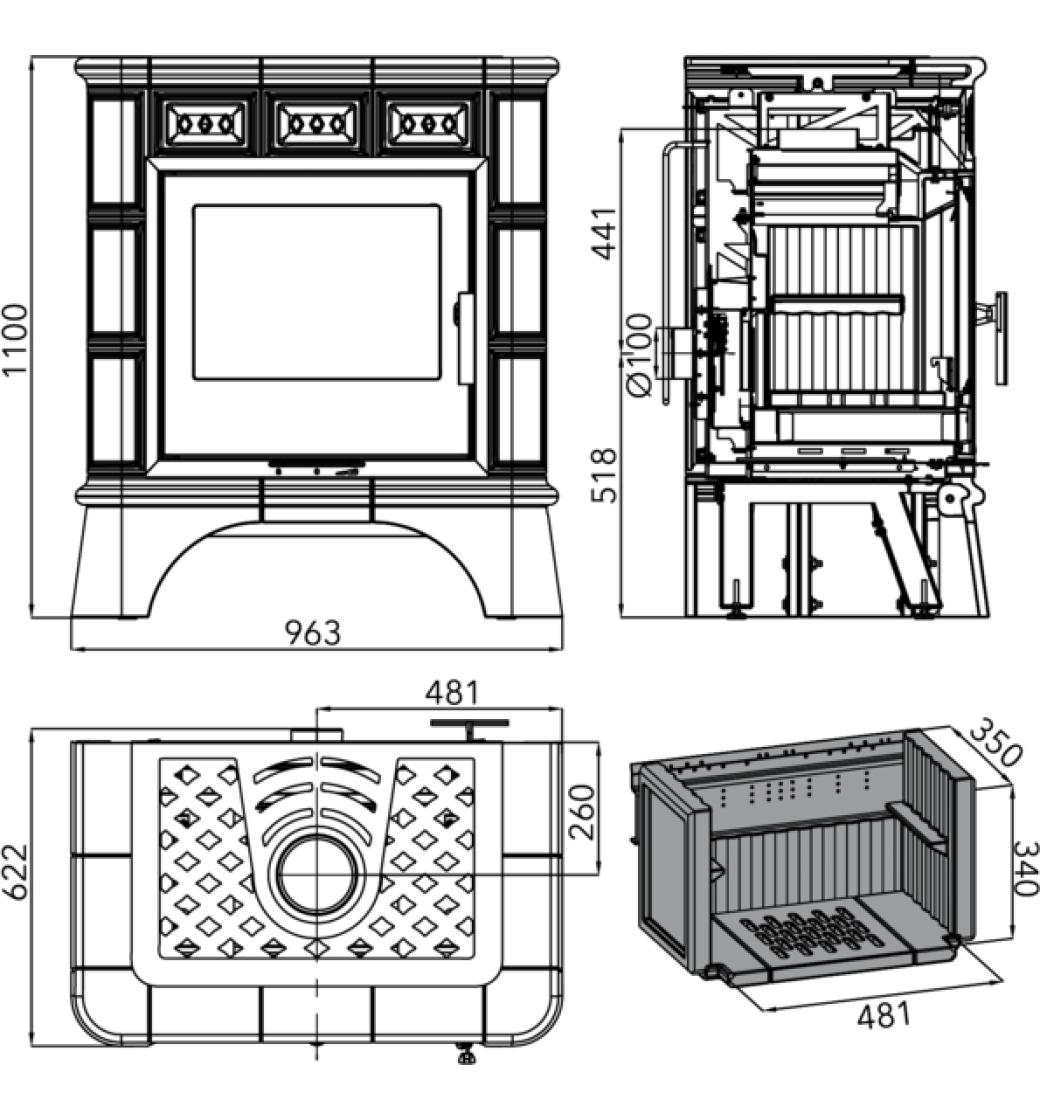 Ve spodní části spalovacího komory je zpravidla umístěn jednoduchý, pevný litinový rošt. Před roštem je umístěna zábrana proti vypadávání a sesouvání paliva na dvířka (čelní sklo). Pod roštem je prostor pro popelníkovou zásuvku. Prostor ve spodní části kamen může být využit jako zásobník paliva. Opláštění kamen může být provedeno z ocelového plechu, keramických dlaždic popř. obloženo silnostěnnými kachlemi nebo přírodním kamenem. Ocelová konstrukce kamen včetně plechových obkladů je chráněna speciální žáruvzdornou barvou.