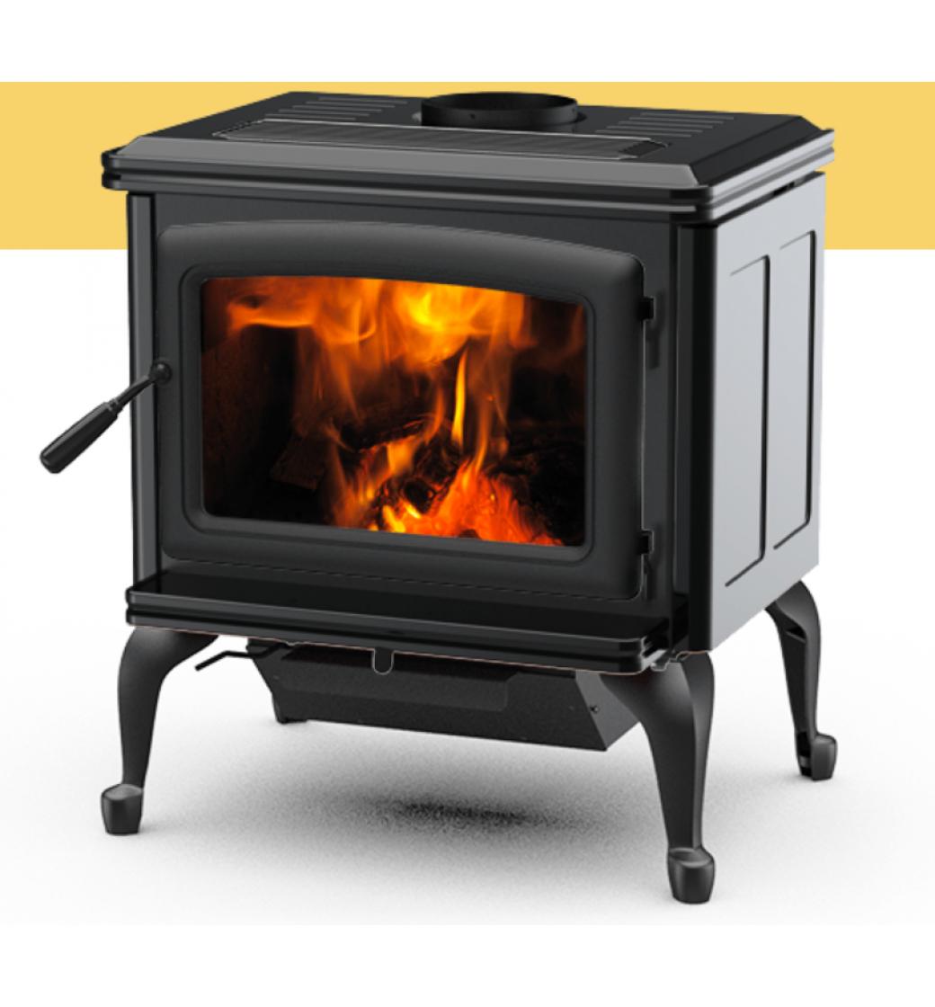 Kanadská kamna Pacific Energy VISTA CLASSIC černý smalt, černé dveře, černá mřížka, černé nožičky a popelníkový systém