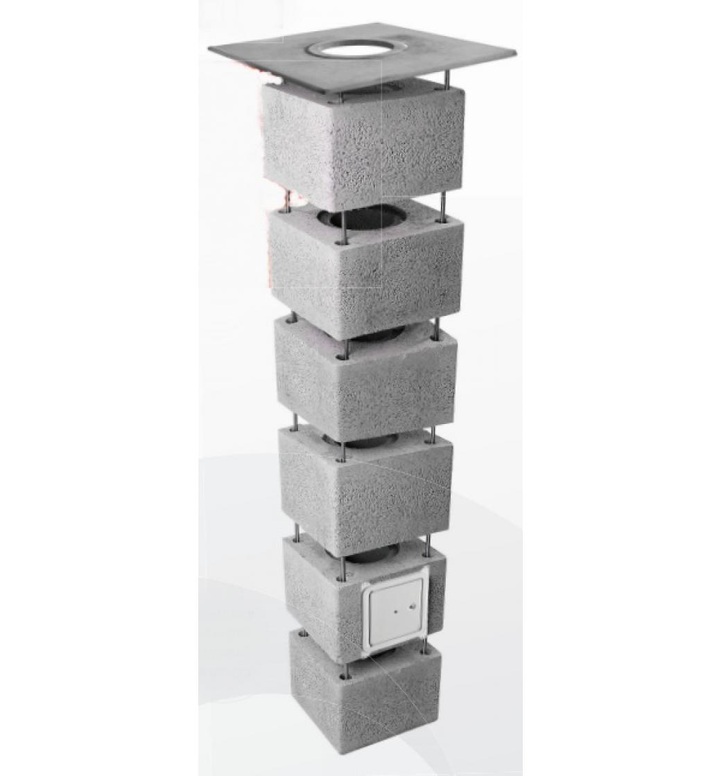 Sestava obsahuje: komínové tvárnice, blok s vybíracími dvířky, krycí desku, připojovací díl 90°, přechodový díl komín/kouřovod, lepidlo