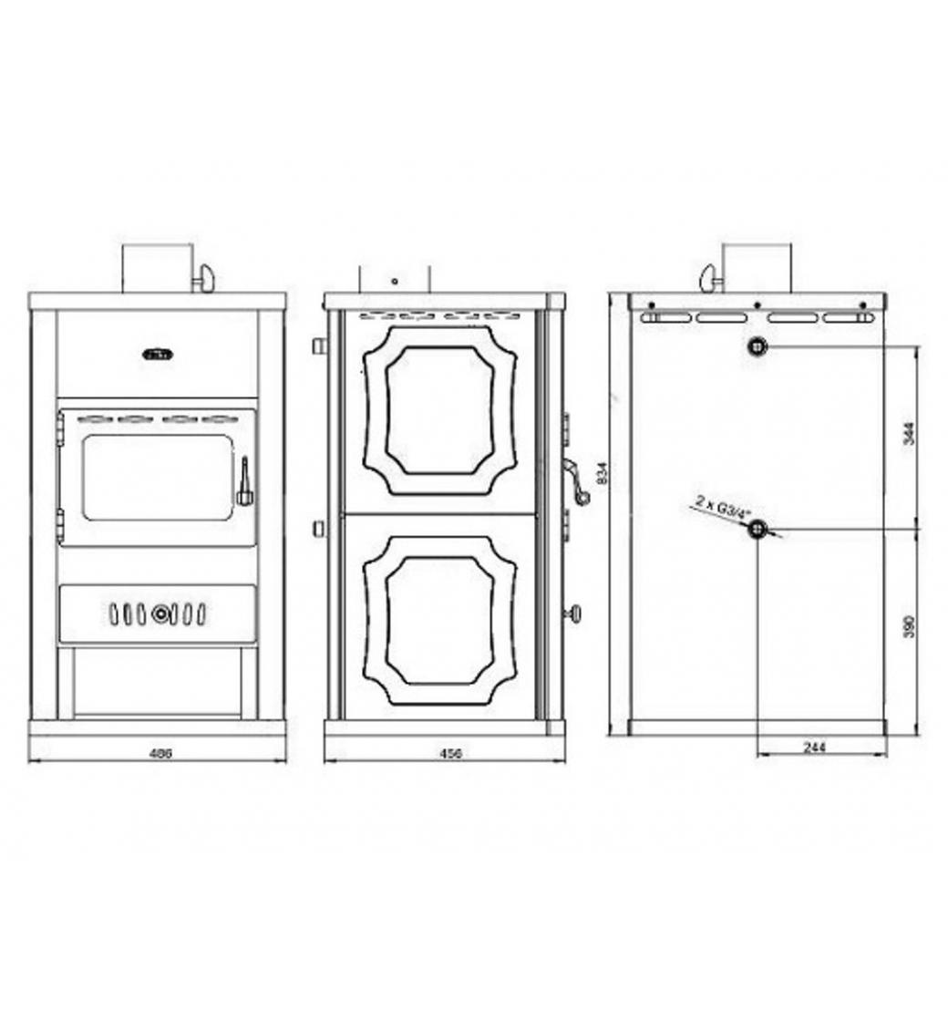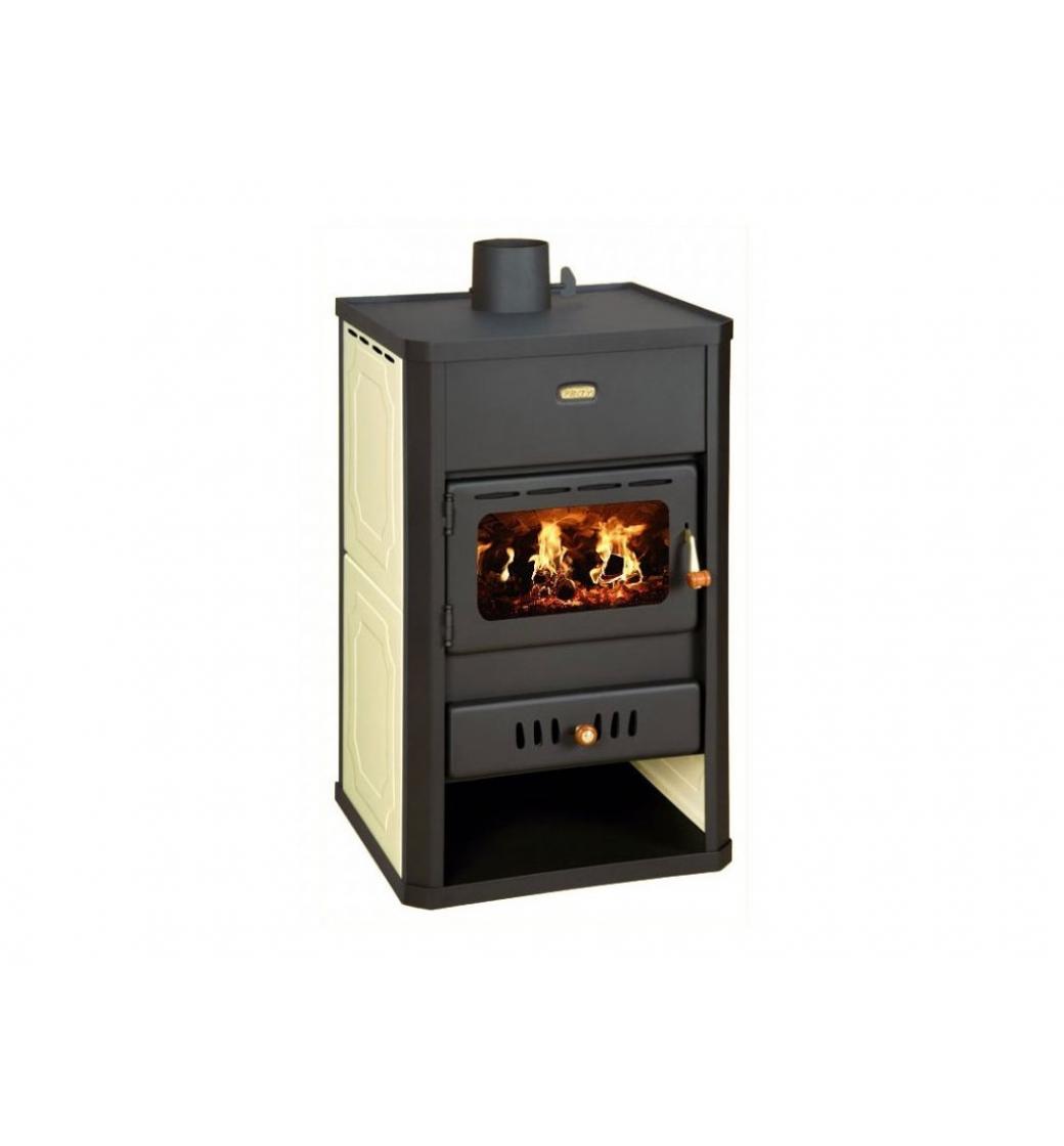 Výkonná krbová kamna s teplovodním výměníkem. Výměník je situován do 3 svislých stran kolem topeniště a vodorovně v příčce před odtahem spalin na výstupu z kamen. Součástí je litinový rošt. Na horní desce je umístěn čistící otvor. Přívod primárního vzduchu je regulovatelný přes popelník, sekundární vzduch oplachuje sklo a nelze jej regulovat. Materiál: 3+4+5 mm plech, samovypalovací černá barva