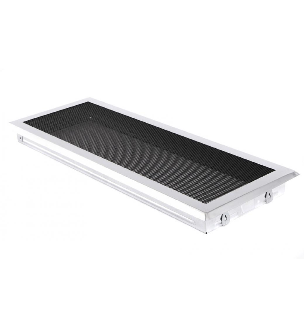 Ventilační mřížky různých rozměrů a v několika barvách. Ocelové s montážním rámečkem, lakované práškovou barvou vysoké kvality, která je odolná vůči vysokým teplotám. I po několikaletém provozu zachovává svůj původní lesk a odstín. Mřížky plní též funkci dekorační. Slouží ke clonění ventilačních otvorů. Jsou vyrobeny z ocelových částí a příslušně upraveny technologickým procesem. Tento typ mřížek je určen pro montáže do komínových sopouchů, stěn a podlah (nepoužívat na stropech).Krbové mřížky - hranaté