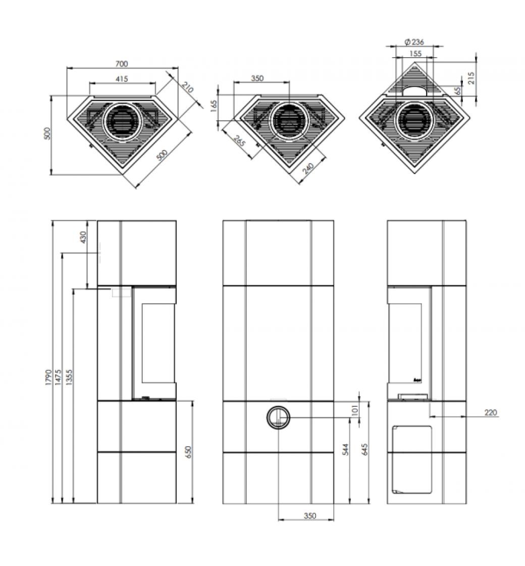 Krbová sestava je svým vzhledem vhodná pro postavení do rohu místnosti. Zadní strana kamen je však zkosená, což umožňuje efektivní a pohledově atraktivní umístění i k rovné zdi.