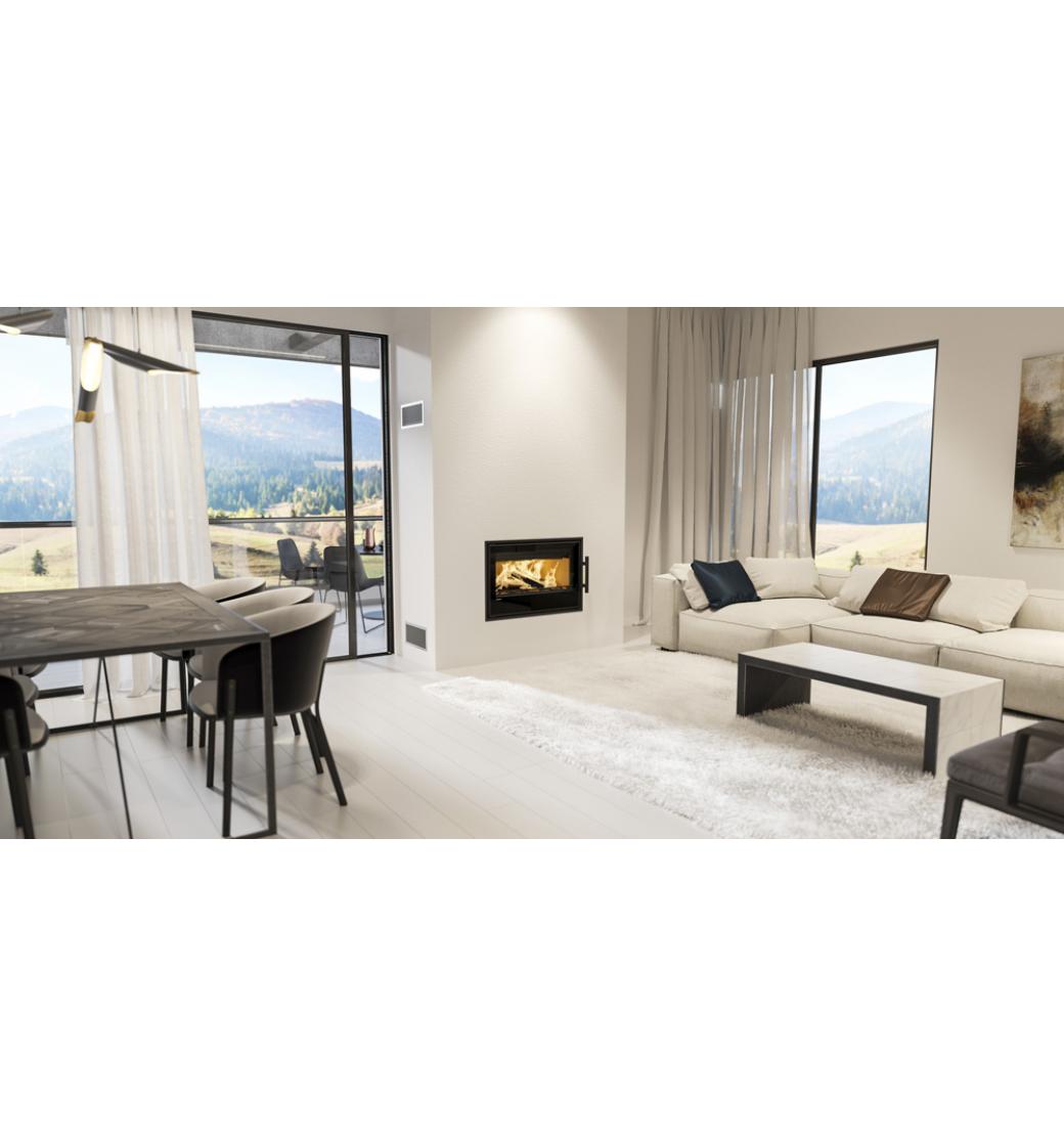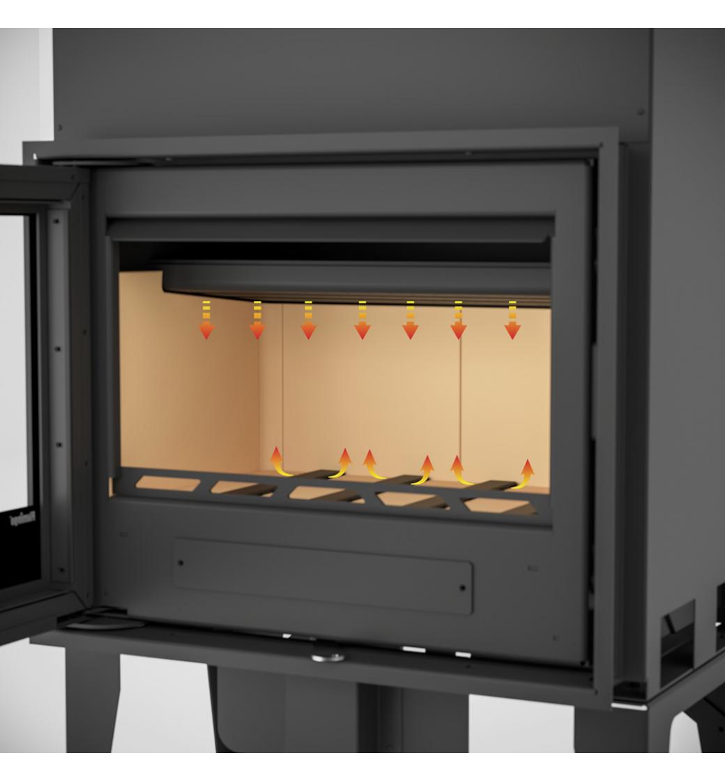 Revoluční řešení spalovací komory nabízí nepřekonatelný zážitek z ohně. Dřevo hoří po celé ploše dna, díky systému bezroštového spalování a systému kanálků na přívod vzduchu. Výsledkem je minimální spotřeba paliva. Pohled do ohně jsme povýšili na novou úroveň.