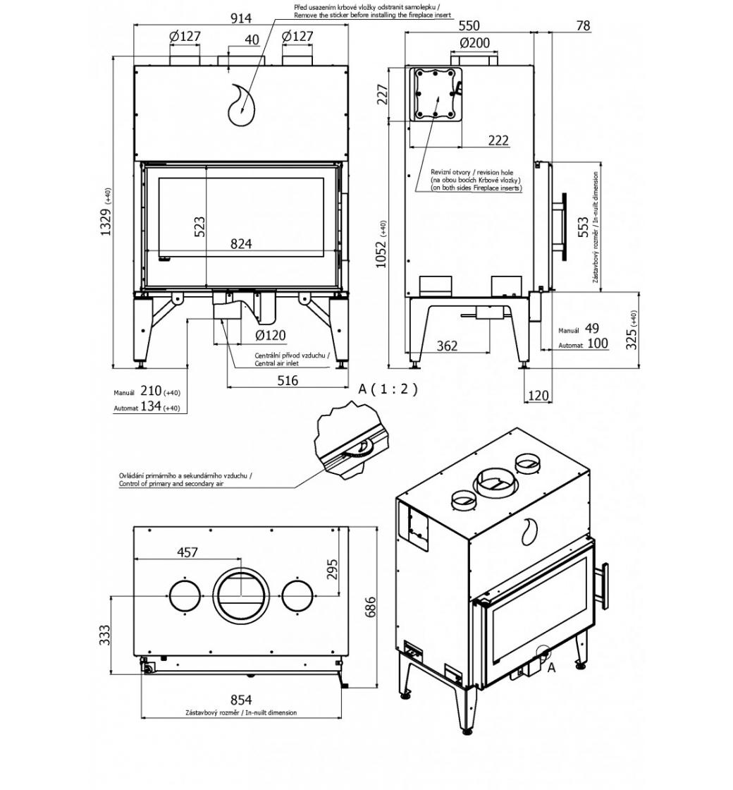 Manuální regulace - nerezové ovládání přímo na krbové vložce. Pomocí ovladače přívodu vzduchů si sami nastavíte optimální výkon. Ovladač je velice jednoduše ovladatelný a nepůsobí rušivě.