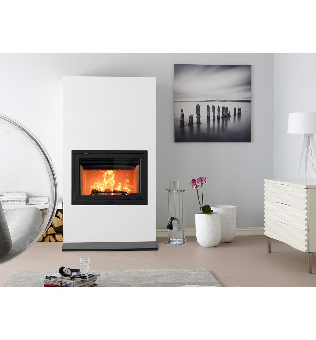 Vnitřní obložení z bílého smaltu dodává krbové vložce půvab, i když se v ní zrovna netopí. Oplach horkým vzduchem udržuje sklo dvířek čisté. Jøtul I 570 Flat je možné kombinovat s obestavbou Jøtul FS 166 (mastek).