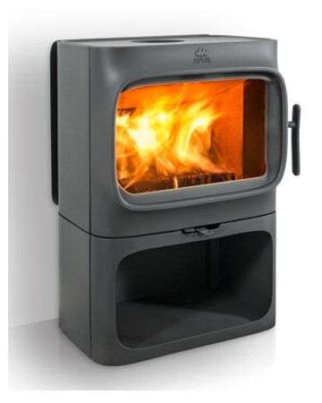 Model Jøtul F 305 B stojí na praktickém podstavci, který lze používat pro ukládání dřeva. Za velkými prosklenými dvířky je ukrytý praktický popelník.