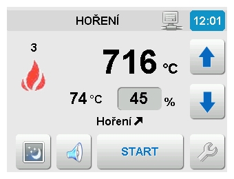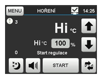 Start regulace hoření se provádí před každým přiložením paliva stiskem tlačítka na panelu nebo formou automatického startu v případě instalace dveřního spínače. Ovládací software osahuje i softwarový dveřní spínač, který vyhodnocuje dle teploty spalin otevření dvířek a automaticky provádí start regulace v případě, že uživatel nestiskl start na displeji /pozn.: tato funkce je doplňková a není spolehlivá v případech nestandartního postupu přikládání paliva/.V případě požadavku je možno regulaci přepnout do manuálního režimu a nastavit pevnou polohu klapky.