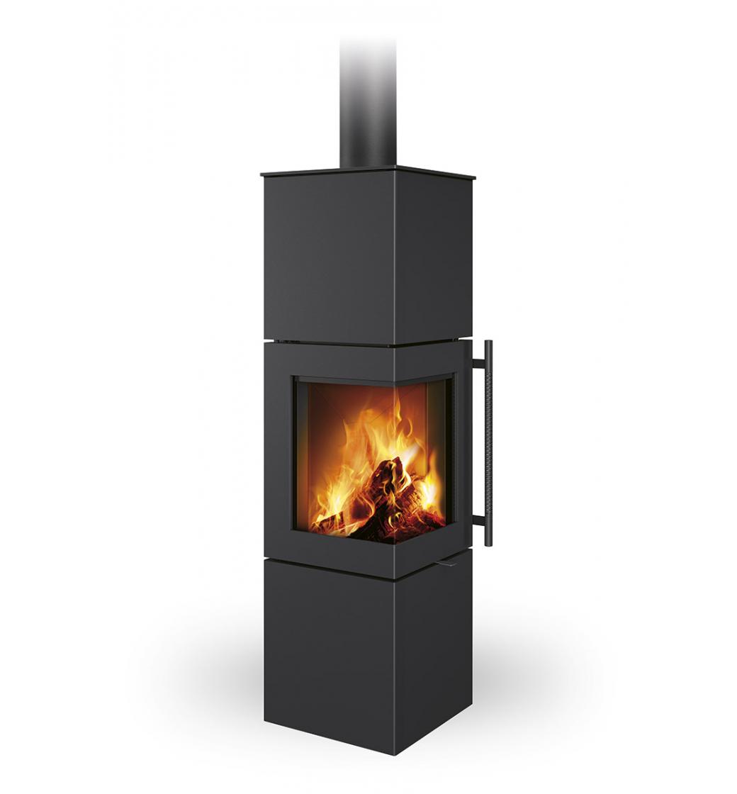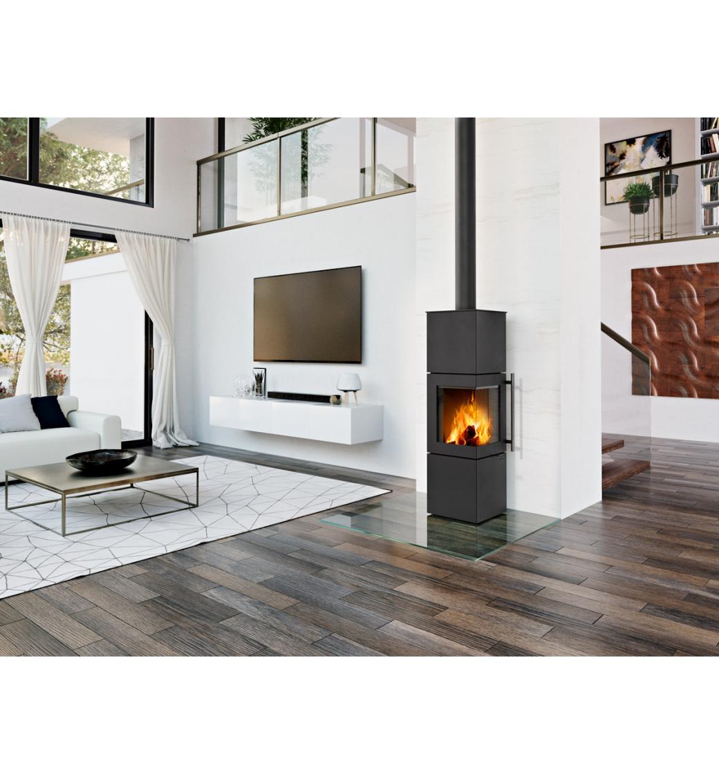 Odvod spalin lze zvolit horní nebo zadní, což umožňuje flexibilní instalaci v libovolném prostoru. Sekundární vzduch zajišťuje oplach skla, brání usazování nečistot a zachovává čistý výhled na oheň. Spalovací komora je vyložena odolným materiálem IGNITON, který lépe akumuluje teplo a odolává vysokým teplotám.