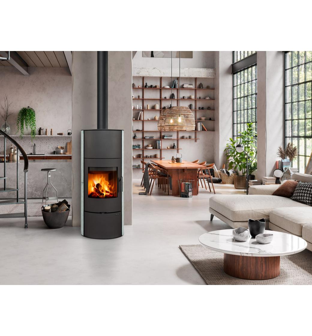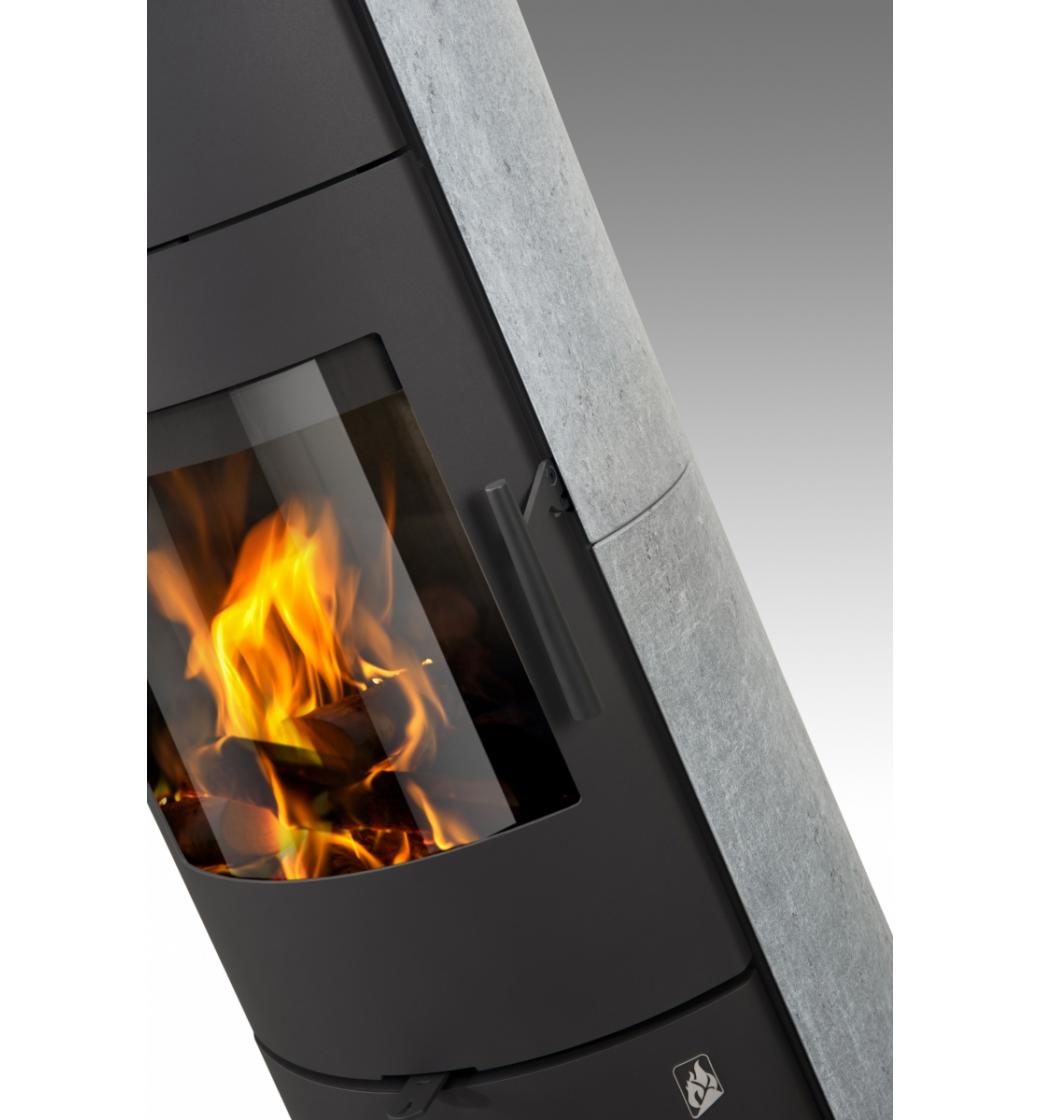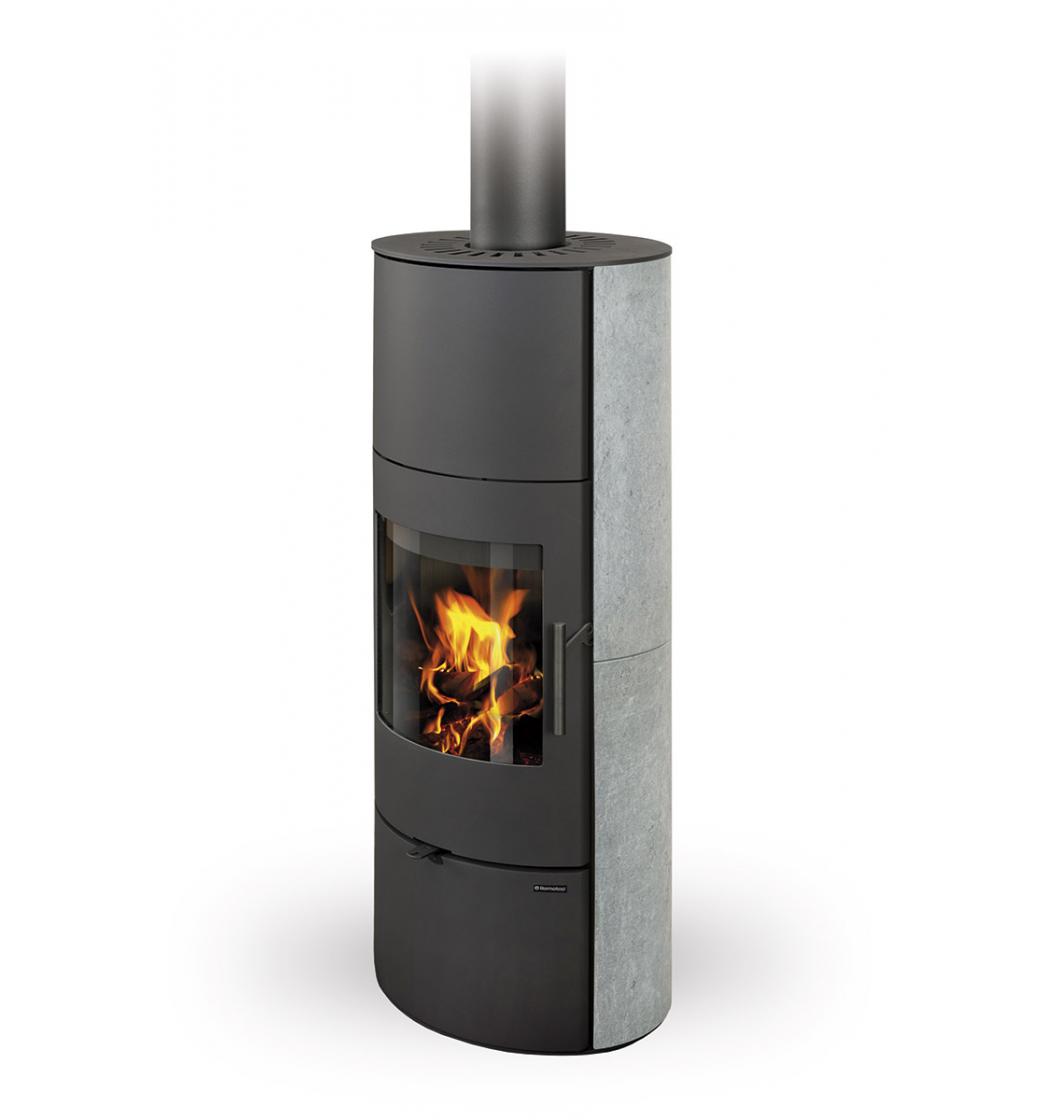 Akumulační krbová kamna Romotop EVORA H v kamenném provedení zaujmou svou štíhlou vysokou konstrukcí s oblíbenou oválnou základnou. Kamený obklad nejen podtrhuje elegantní vzhled, ale zároveň zvyšuje schopnost kamen akumulovat teplo a postupně jej sálat do prostoru, což je ideální pro komfortní a úsporné vytápění.