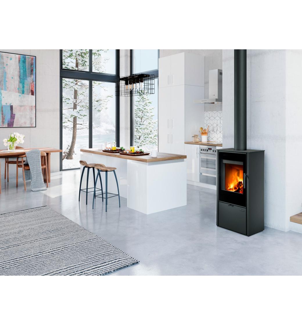 Dvířka mají velkoplošné designové prosklení a kamna disponují systémem CPV – centrální přívod externího vzduchu. Ve standardní výbavě lze využít horní nebo zadní odvod spalin. Sekundární přívod vzduchu udržuje sklo čisté a zabraňuje usazování nečistot.