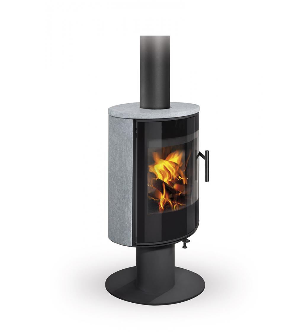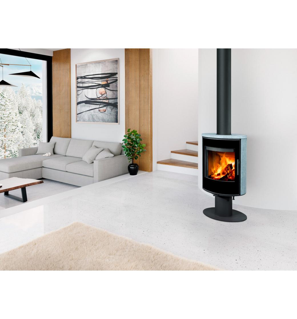 Krbová kamna LAREDO T v kamenném provedení jsou otočným modelem na centrální noze, který umožňuje nasměrovat výhled na plameny podle potřeby. Kamenný obklad zvyšuje akumulaci tepla a dodává zařízení nadčasový, přírodní vzhled vhodný do moderních interiérů.