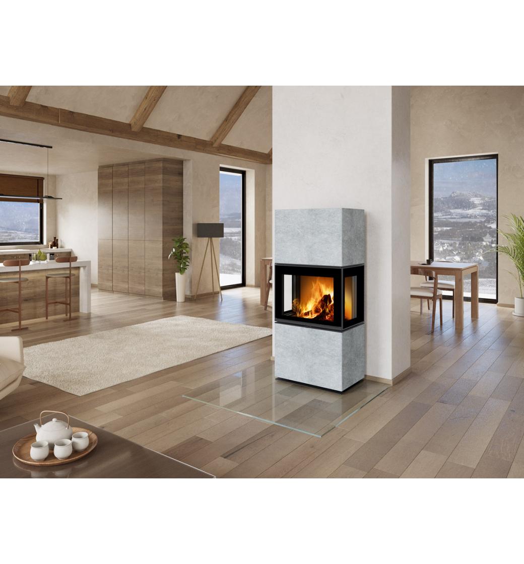 Šamotová spalovací komora, dvojité boční sklo a systém DOUBLE SPIN zajišťují čisté, účinné a ekologické spalování splňující normu Ecodesign. Oplach skla předehřátým vzduchem pomáhá udržovat čelní prosklení čisté, zatímco centrální přívod vzduchu (CPV) garantuje bezpečný a stabilní provoz.