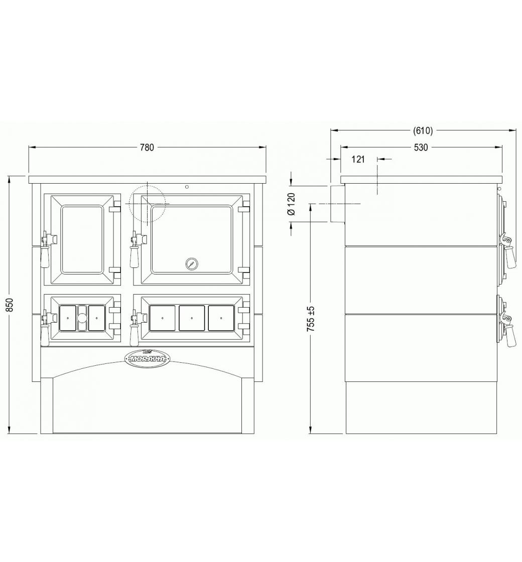 Topeniště je tvořeno jako tradičně silnými šamotovými cihlami a pevným litinovým roštem. Tyto materiály máme již léta ověřené, jsou odolné vysokým teplotám, vyznačují se pevností, stálostí tvaru a schopností déle temperovat. Do topeniště je možné vkládat polena až o průměru 160 mm a délce 340 mm. Trouba sporáku je smaltovaná a uvnitř je zabudovaný drátěný program, jehož součástí je kovová mřížka a hluboký pekáč. Teploměr na dvířkách trouby slouží k indikaci teploty v troubě. Nad dvířky trouby je umístěna páka na ovládání funkce vaření a pečení.