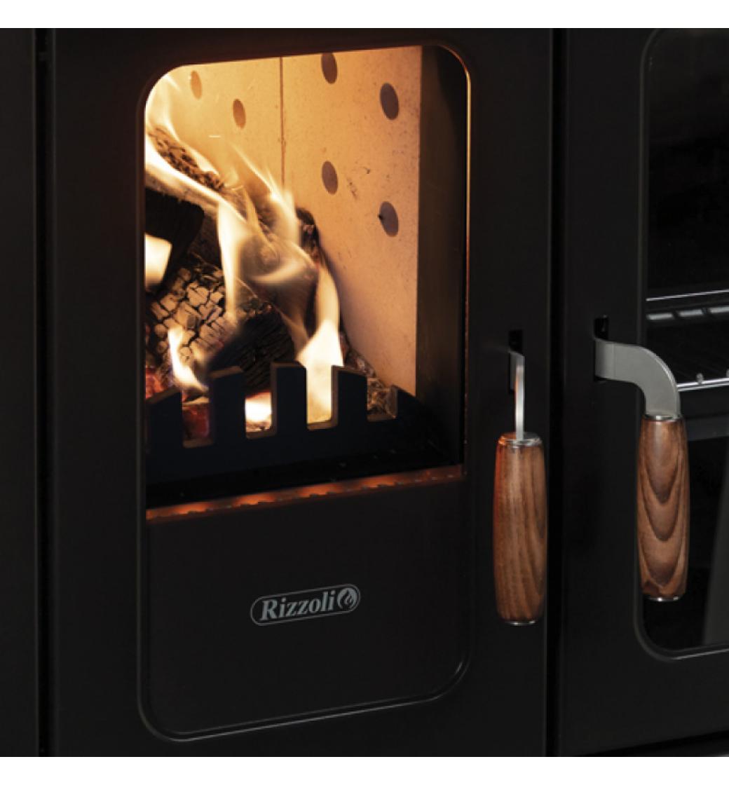 Sporák na dřevo Rizzoli N 94 Steel má lakovaný ocelový plášť sporáku, dřevěné kličky. Sporáková plotna PC2 (skládaná ze segmentů).Barevné provedení: Černá