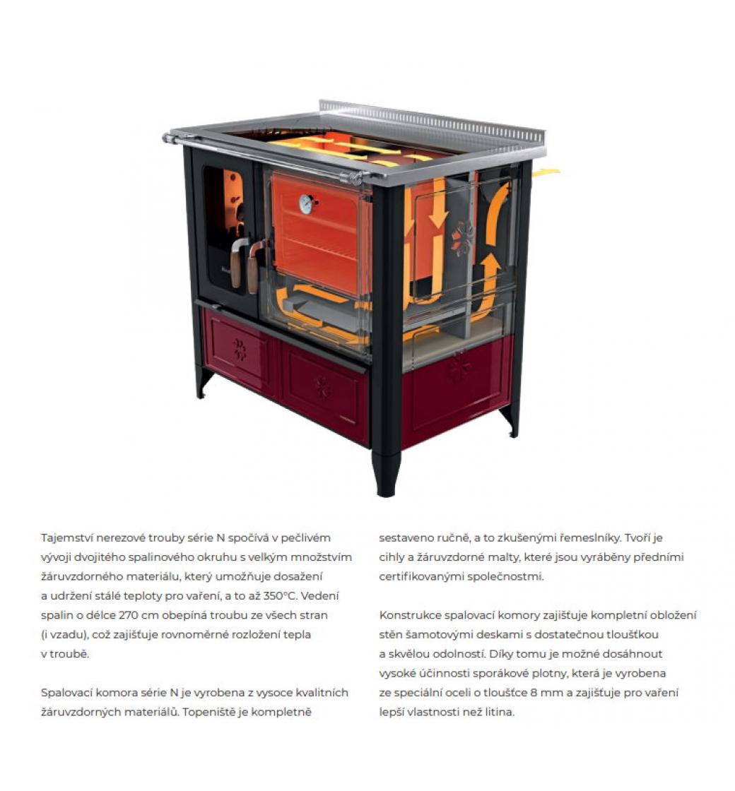 Sporáky série N jsou z vysoce kvalitní oceli, spalovací komora z certifikovaného žáruvzdorného materiálu a plotna ze speciální oceli v kombinaci s rukojetí z ořechového dřeva. Vyniká vysokou kvalitou zpracovní, funkčností a použitými technologiemi. Hlavním benefitem je pak cenová dostupnost.
