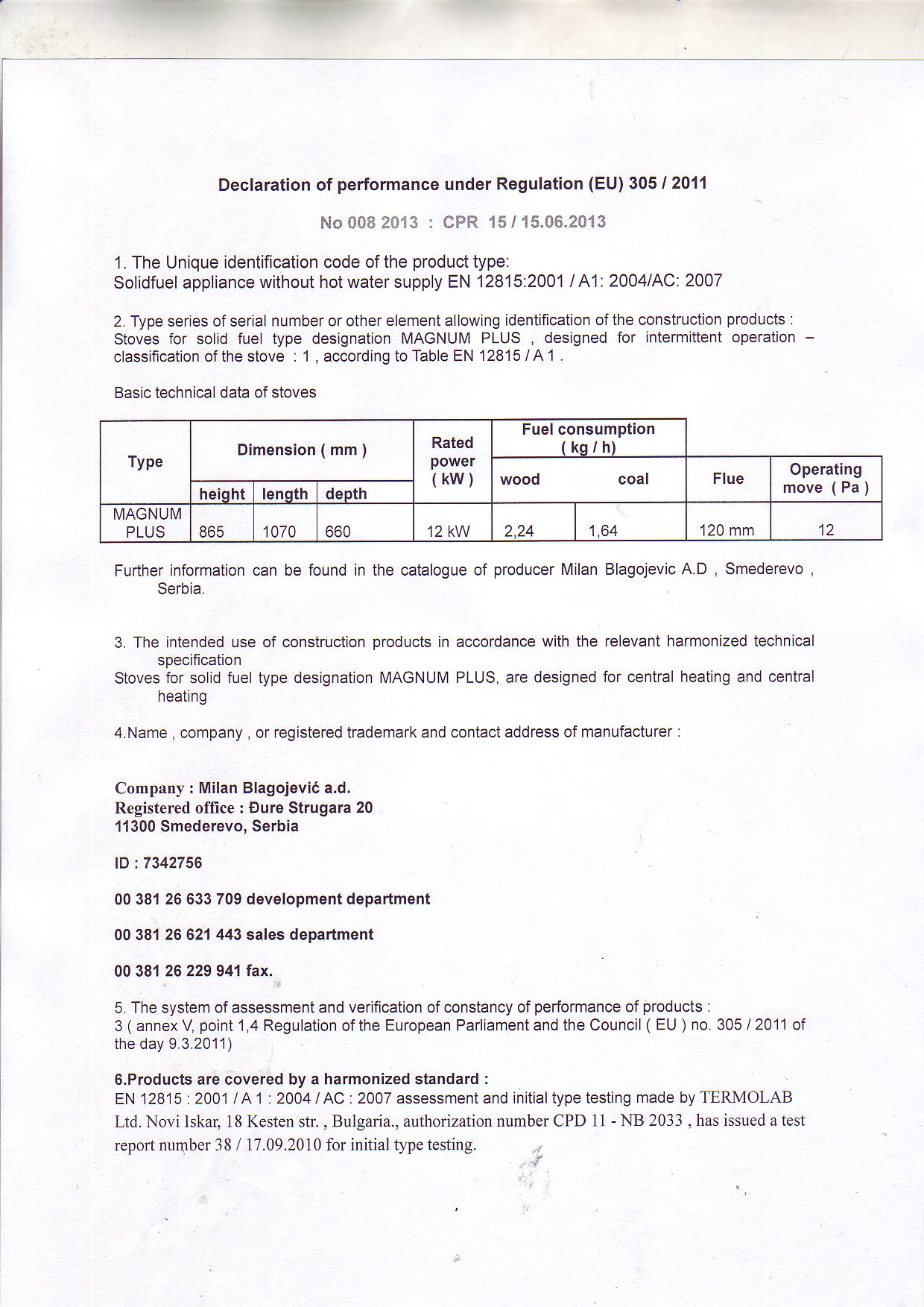 Magnum sporák je určen k přípravě jídla (vaření, pečení) a k vytápění obytných prostorů. Konstrukcí i způsobem používání se výrazně liší od klasických sporáků na pevná paliva, protože má možnost regulace provozu a nastavení přívodu vzduchu ke spalování. Tyto přednosti umožňují větší účinnost a lepší stupeň využití tepelné energie. Pracovní plocha sporáku je tvořena litinovým rámem, ocelovou plotnou a kulatým víkem plotny. Se sporákem se dodává i přípojka na odvod kouře, která je z litiny. Těsnění mezi plotnou a rámem sporáku je provedeno keramickým vláknem Ohniště je vyloženo litinovými pláty. Všechny odlitky jsou vyrobeny z šedé litiny, což zajišťuje dlouhodobé použití. Trouba sporáku je smaltovaná. Dvířka topeniště, trouby, popelníku a ohř.prostoru jsou z litiny. Dvířka trouby a topeniště jsou prosklená a dvířka trouby mají teploměr. Vnější boční strany, zadní strana a plech trouby jsou vyrobeny z oceli a chráněny smaltem. U typu v provedení mastek jsou boční stěny obloženy kamenem.