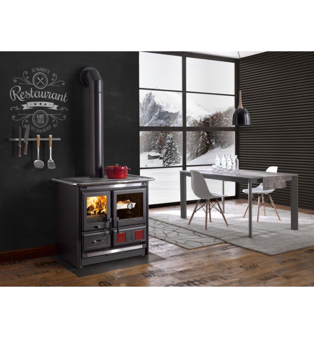 Kvalitní litinový sporák na topení dřevem a dřevěnými briketami s proskleným ohništěm a smaltovaným ocelovým obkladem, zaručující okamžité předávání tepla. Tento typ se pyšní velkou pečící troubou o objemu 55 l. Trouba je oboustranně smaltovaná, tudíž její povrch je odolný proti propálení a snadno se udržuje. Ve dvířkách trouby je integrovaný teploměr pro rychlou a přesnou kontrolu teploty, který tak zaručuje pohodlné pečení.