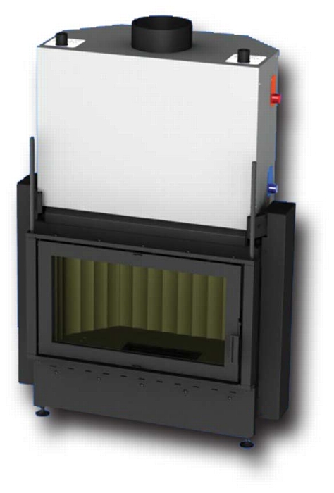 Teplovodní krbová vložka, dvířka s rovným prosklením a horním zdvihem, teplovodní výměník s vychlazovací smyčkou.Teplovodní krbová vložka Kretz B104 - V15