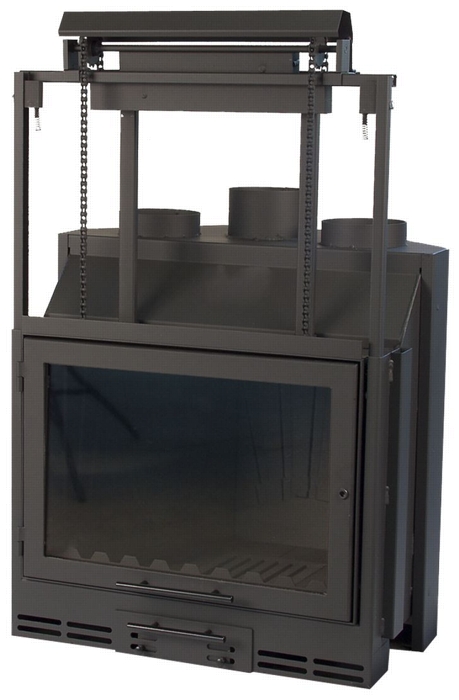 Dvouplášťová ocelová vložka s rovným sklem a horním zdvihem dveří, umožňující připojení teplovzdušných rozvodů.Teplovzdušná krbová vložka Kretz A 404
