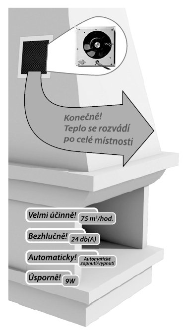 - Ventilátor rozvádí horký vzduch z krbové vložky do místnosti